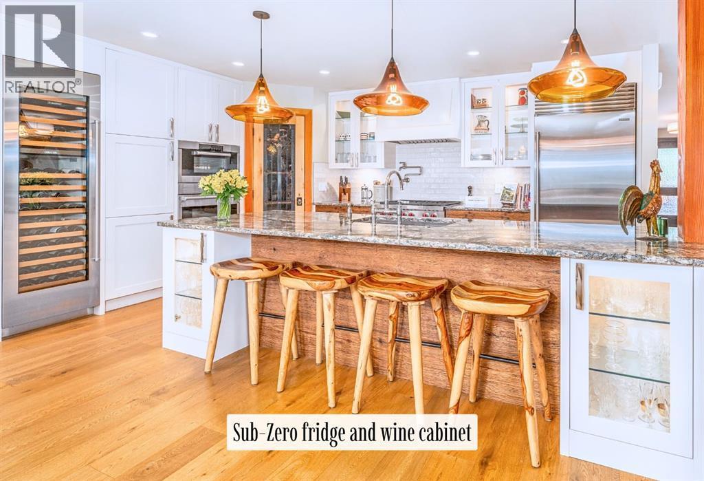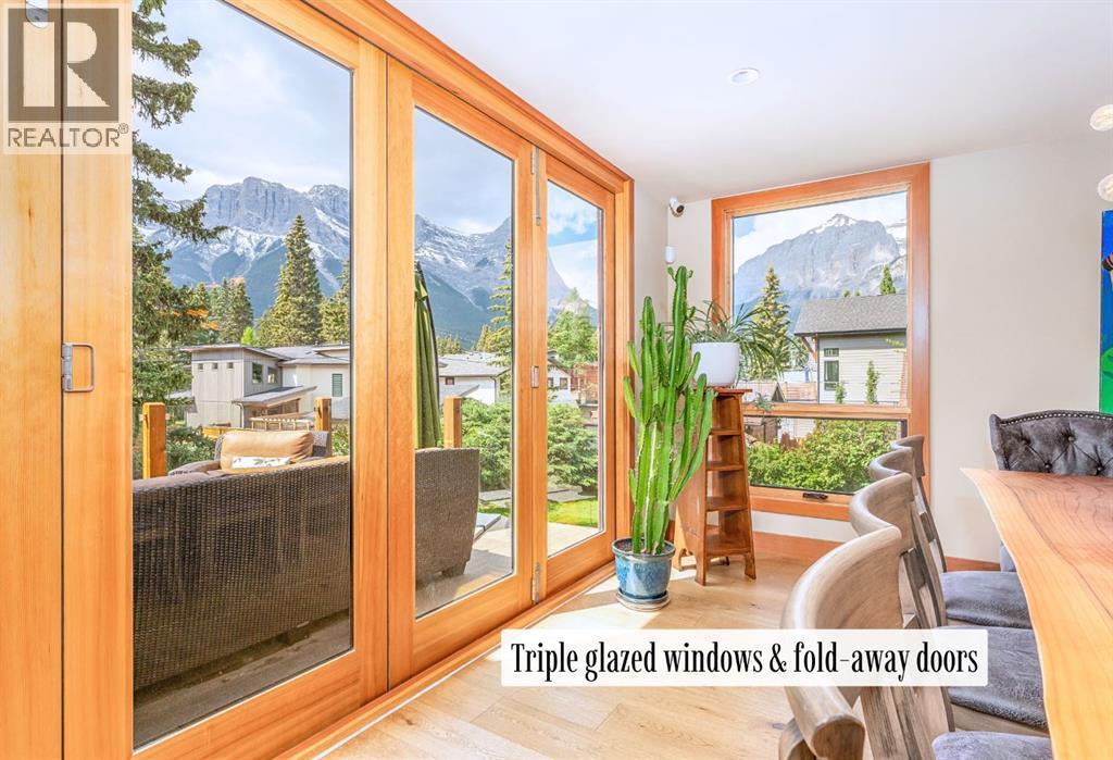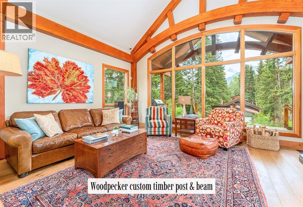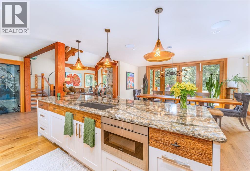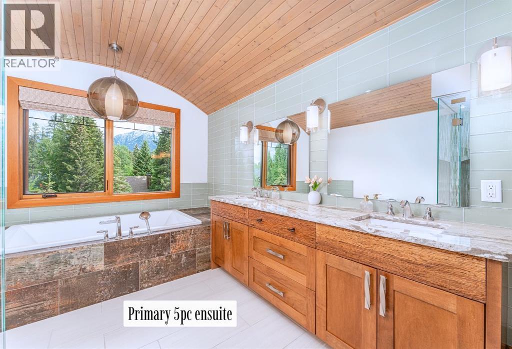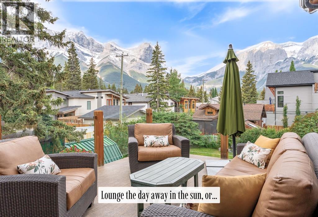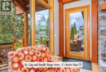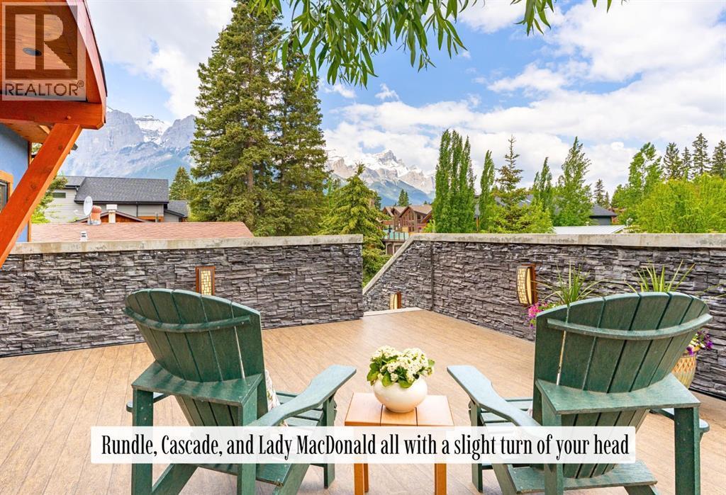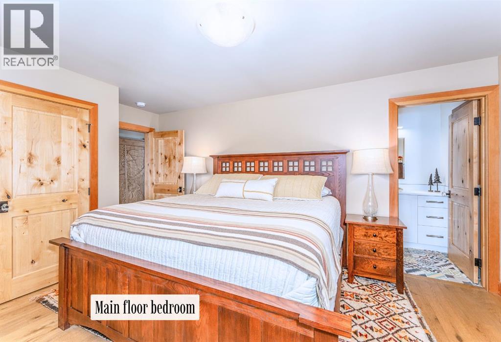 Welcome to an exceptional luxury home in the heart of South Canmore, where mountain living meets refined design in the most coveted neighbourhood in town. Framed by sweeping alpine vistas and set on quiet 4th Street, this remarkable 5-bedroom + office, 5-bathroom residence was thoughtfully designed as a forever home, perfectly balancing timeless architecture and generational functionality.From the moment you arrive, the home’s distinctive curved post-and-beam architecture makes a lasting impression. Graceful arcing rooflines echo the surrounding peaks, while the rich wood detailing creates a sense of warmth and permanence. Every line feels intentional, every space designed to evolve with you and your family through every stage of life.On the main floor, a serene bedroom with a full ensuite offers the ease of one-level living, ideal for guests or future accessibility. A built-in elevator connects every floor effortlessly—perfect for post-surgery recovery, limited mobility, or simply carrying groceries with ease. At the front of the home, a professional office provides a polished and private space to meet with clients, bathed in natural light and framed by peaceful neighbourhood views.The heart of the home unfolds in the breathtaking great room. A dramatic floor-to-ceiling wood-burning fireplace anchors the space, inviting cozy evenings as snow falls softly outside. Vaulted ceilings soar overhead, accentuated by curved timber beams that draw your eye upward—and outward—to the iconic Three Sisters. Walls of glass blur the boundary between indoors and out, filling the room with sunlight and ever-changing mountain moods.Step outside to spectacular outdoor living. The expansive south-facing deck is designed for every season: partially covered for year-round comfort, partially open for sun-soaked afternoons, stargazing nights, and front-row seats to the northern lights. Unobstructed views of Ha Ling Peak rise boldly before you, creating a backdrop that feels both d ramatic and deeply calming.Downstairs, the second living room is bright and welcoming, with high ceilings and a wall of windows looking out over the charming fenced yard where mature and younger trees create layered privacy. Get used to gathering around the firepit under a canopy of stars, or enjoy quiet mornings surrounded by birdsongs. The large front deck captures warm afternoon and evening sun, offering sweeping views across the valley to the Cascade and Lady McDonald ranges—an ever-changing landscape of light, shadow, and alpen glow.The luxury kitchen blends striking aesthetics with intelligent design. High-end (Wolf & Sub Zero) appliances, premium finishes, and thoughtful storage make it as functional as it is beautiful. The partially open-concept layout keeps conversations flowing between the kitchen, generous eating bar, and spacious dining room—perfect for lively gatherings, holiday dinners, or intimate family meals.Adding to the home’s versatility is the option https://youtu.be/ev5eKVHPU5o (id:6769)