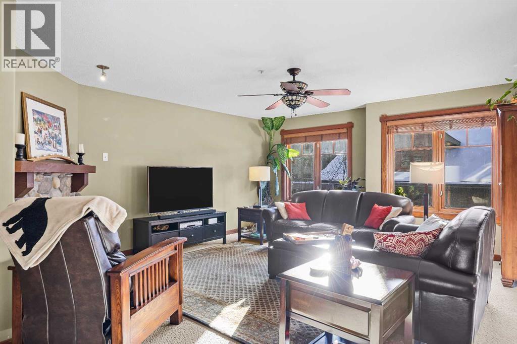 This is the sunny home with mountain views you’ve been waiting for! Located on the quiet south side of the building and spanning the top two floors, this fabulous 2 bedroom, 2 bathroom condo enjoys plentiful sunshine year-round with enviable Three Sisters Mountain views. The spacious open-plan living level is flooded with light from all the south facing windows, yet offers privacy from mature trees, and comprises a very spacious kitchen with eating bar, huge living room with gas fireplace, and a generous dining area that will encourage you to invite guests! Step out onto the sunny deck to enjoy your morning coffee with Three Sisters Mountain views, or take a walk by the Bow River along nearby trails. After a fun day in the mountains, the adjacent amenities building offers abundant relaxation opportunities and entertainment for your family and guests, including indoor and outdoor hot tubs, well equipped gym, a sauna, pool tables, lounge area with large screen TV, and ping-pong table. Easy access to endless trails, and the convenience of the newly developed Gateway retail park just down the road. The free Roam bus stops right outside the complex for added convenience. This beautifully presented home offers the rare combination of a quiet location, abundant sunshine, mountain views, convenient amenities and easy access to local facilities. Don’t hesitate – book your viewing today! One heated underground parking space (plus visitor parking) with adjacent spacious (9’x5’) storage. Please note that short-term rentals are not permitted at this property. There are no age restrictions in this building. (id:6769)