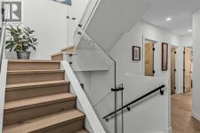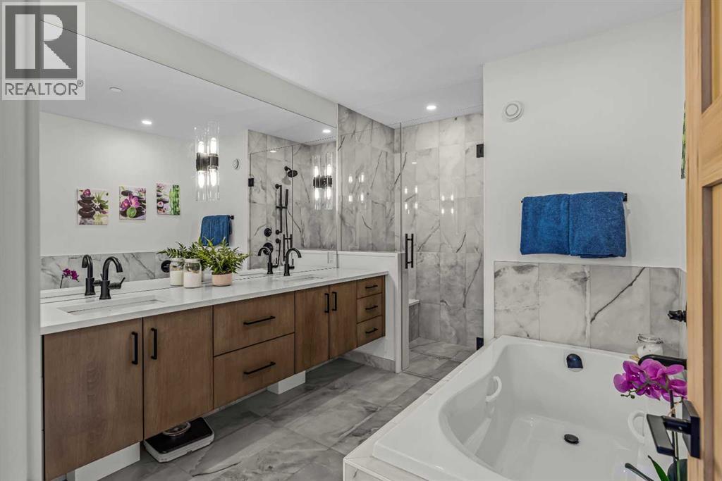 Step into luxury living with this stunning 4 bedroom, 5 bathroom modern built home by Lakusta Custom Homes, who are known for their quality craftsmanship, attention to detail, and refined mountain design. The layout features 2671sqft of livable space spread over three levels with the open concept living and dining area anchoring the home with sleek kitchen appliances and an expansive island leading to a wall of windows that flood the great room with natural light. The beautiful gas fireplace commands the space, making it perfect for gathering with family and friends after a day outdoors. Outdoor living extends seamlessly with a spacious upper-level deck spanning the entire back of the home, overlooking a forested backdrop and generous space that provides excellent privacy. The primary suite is a true retreat, complete with a walk-in closet, soaking tub with a separate luxurious walk-in tiled shower, and serene mountain views from the king bed. Upstairs two spacious bedrooms each with their own spa inspired bathroom and elevated design elements throughout bring comfort and luxury together in perfect balance. Downstairs, there is a media lounge with custom bar, including additional guest space with a large bedroom and 3pc bathroom and access from this level to the 2-car garage and gear storage. Located in a premier Canmore neighbourhood, celebrated for its scenic setting, access to the world class skiing and biking at the Nordic Centre, proximity to the downtown Canmore, trails, and year round recreation. Whether you envision a primary residence or a luxury mountain retreat, this opportunity offers exceptional value in an unbeatable community. (id:6769)