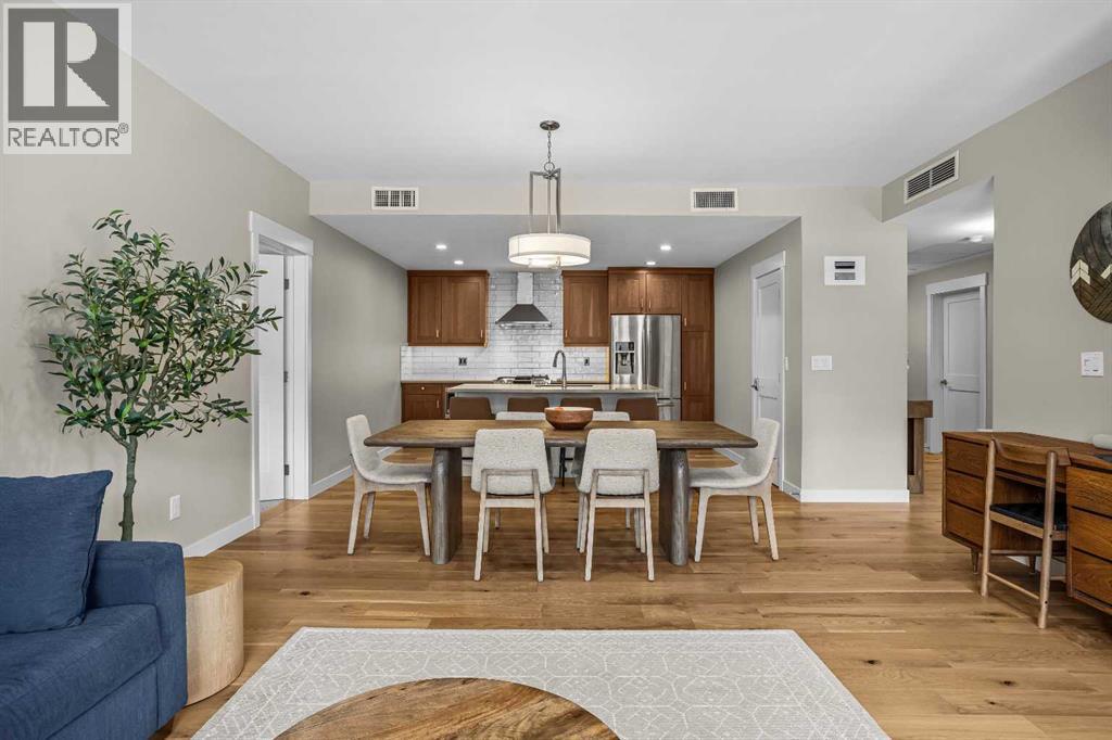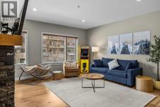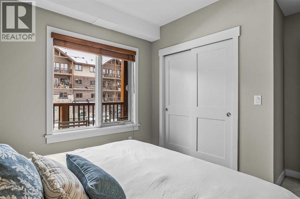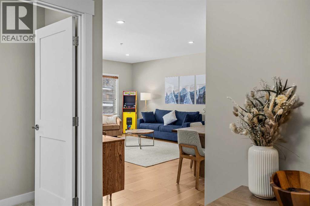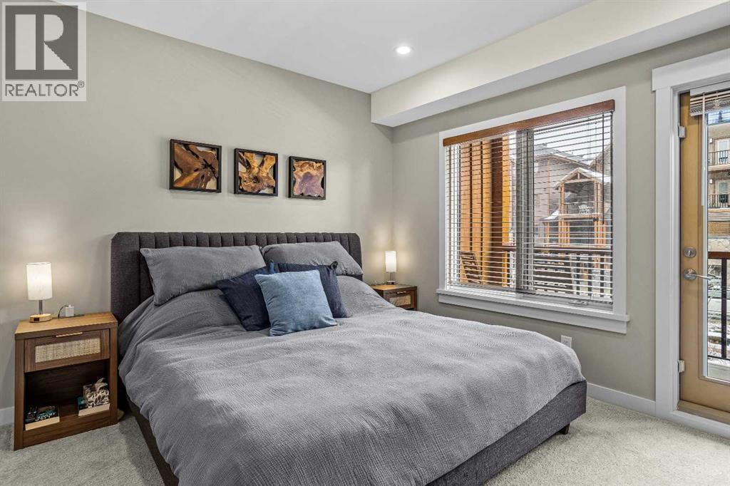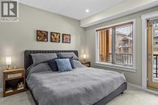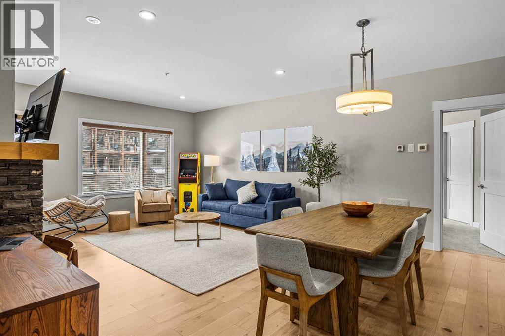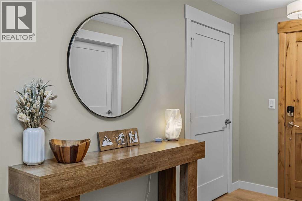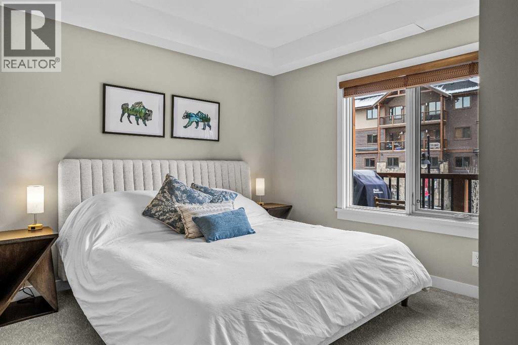 This exceptional 2-bedroom, 2-bath residence offers 1,250 sq ft of beautifully designed space in one of Canmore’s most desirable communities. Blending timeless elegance with modern comfort, it provides an unparalleled mountain lifestyle.Step into a bright, open-concept layout featuring hardwood floors and expansive windows that capture mountain views. The gourmet kitchen seamlessly connects to the dining and living areas, perfect for entertaining or relaxing.The spacious primary suite is a true sanctuary, complete with a private deck, walk-in closet, and a luxurious 5-piece ensuite featuring a soaking tub and glass-enclosed shower. The second bedroom is also generously sized, ideal for guests or a home office. A second deck extends your living space outdoors, perfect for morning coffee. Residents enjoy a fitness center, owner’s lounge, hot tub, and shared laundry facilities, all set within beautifully landscaped grounds. Whether for full-time living, a weekend escape, or an investment, this stunning home is a rare find in within the heart of Canmore. Walking distance to restaurants, coffee shops, Elevation Place, and many walking and biking trails. (id:6769)