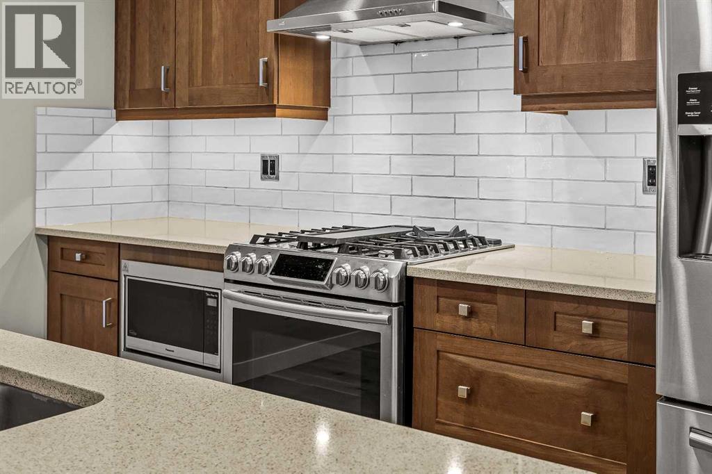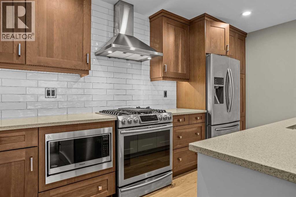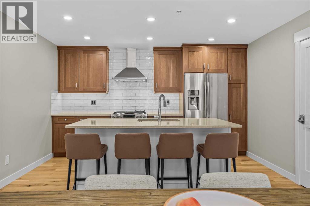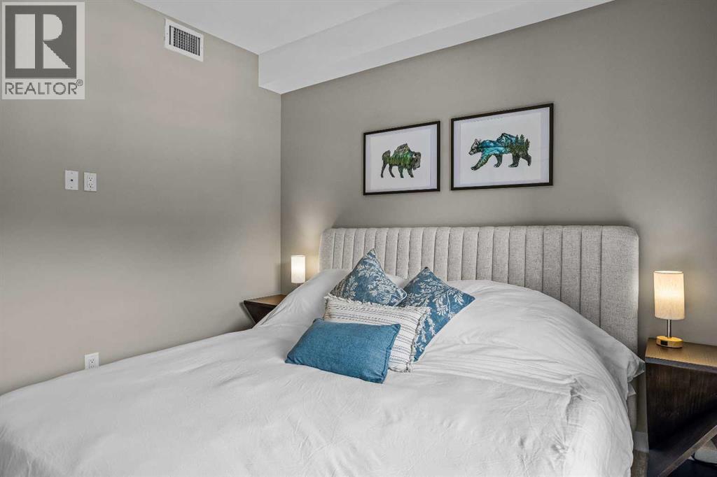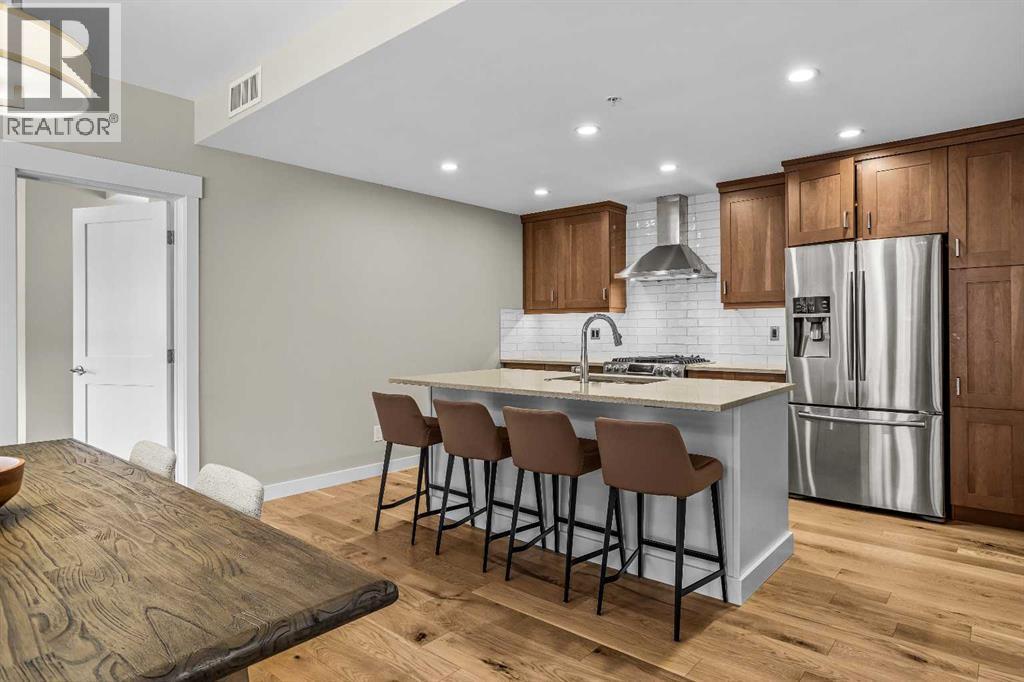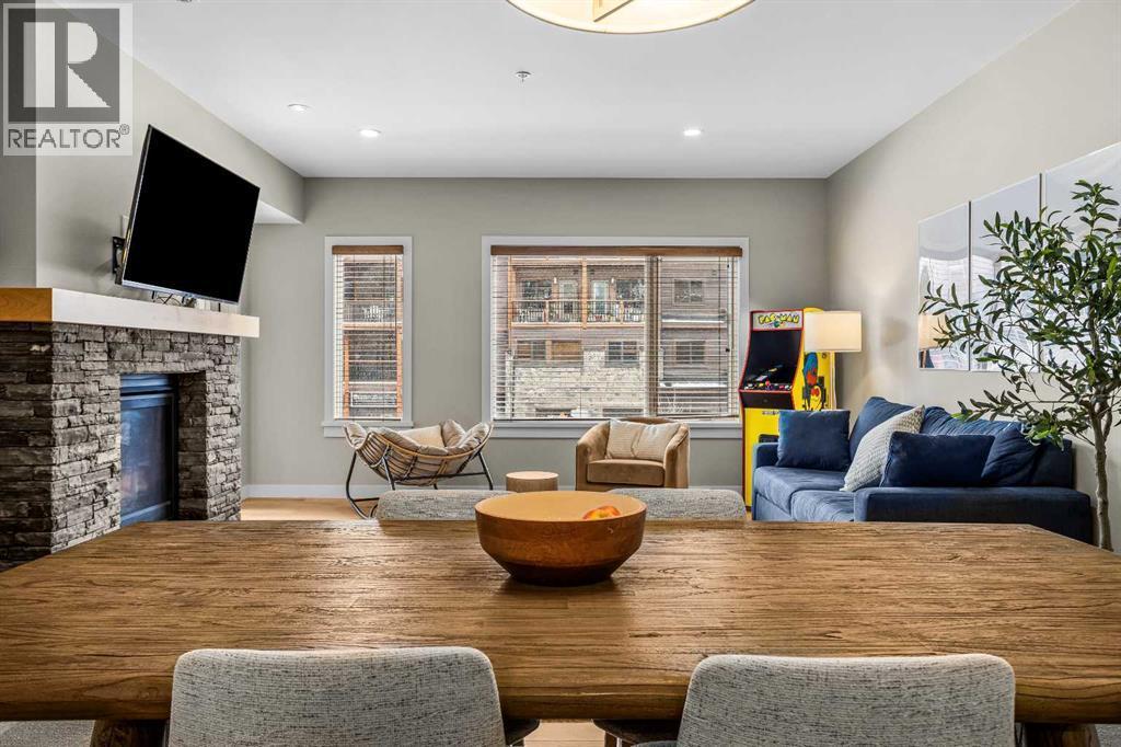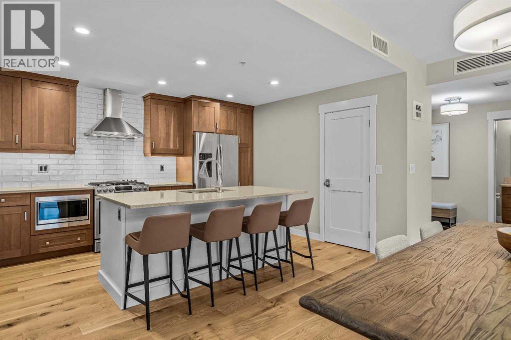 This exceptional 2-bedroom, 2-bath residence offers 1,250 sq ft of beautifully designed space in one of Canmore’s most desirable communities. Blending timeless elegance with modern comfort, it provides an unparalleled mountain lifestyle.Step into a bright, open-concept layout featuring hardwood floors and expansive windows that capture mountain views. The gourmet kitchen seamlessly connects to the dining and living areas, perfect for entertaining or relaxing.The spacious primary suite is a true sanctuary, complete with a private deck, walk-in closet, and a luxurious 5-piece ensuite featuring a soaking tub and glass-enclosed shower. The second bedroom is also generously sized, ideal for guests or a home office. A second deck extends your living space outdoors, perfect for morning coffee. Residents enjoy a fitness center, owner’s lounge, hot tub, and shared laundry facilities, all set within beautifully landscaped grounds. Whether for full-time living, a weekend escape, or an investment, this stunning home is a rare find in within the heart of Canmore. Walking distance to restaurants, coffee shops, Elevation Place, and many walking and biking trails. (id:6769)